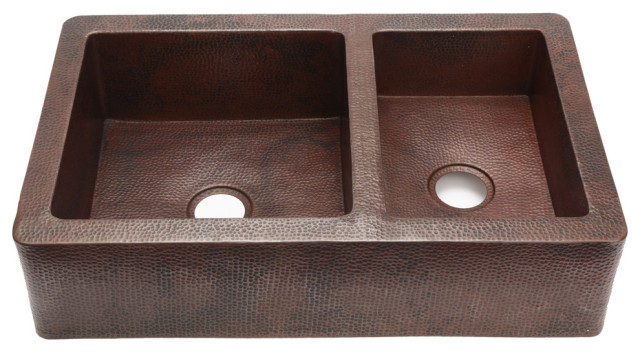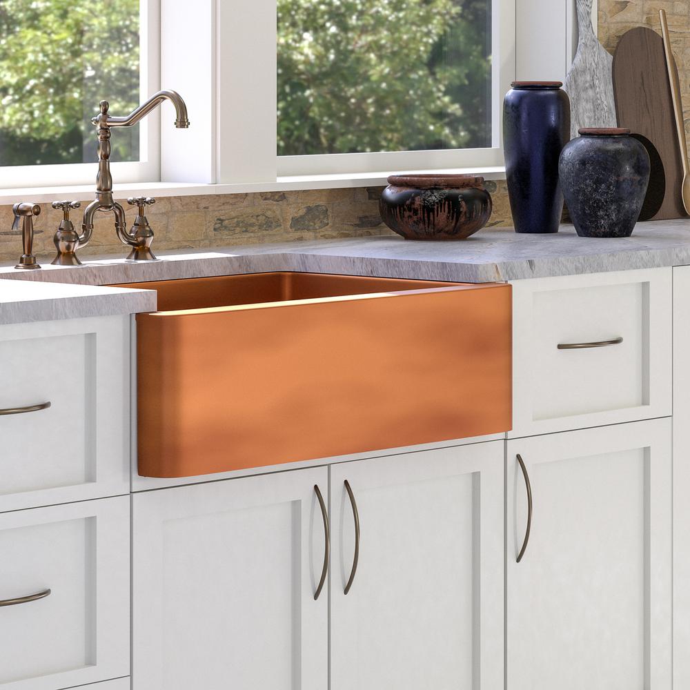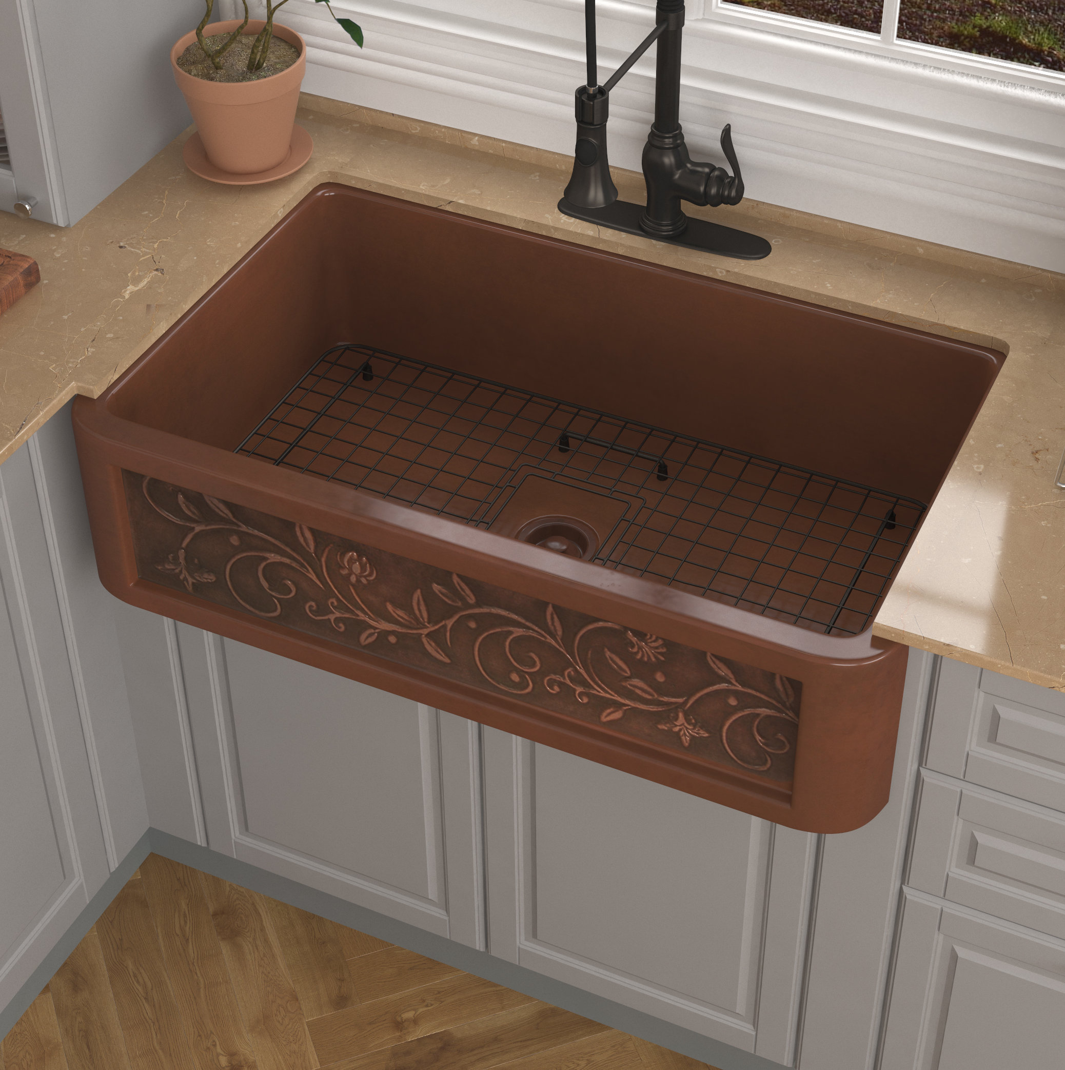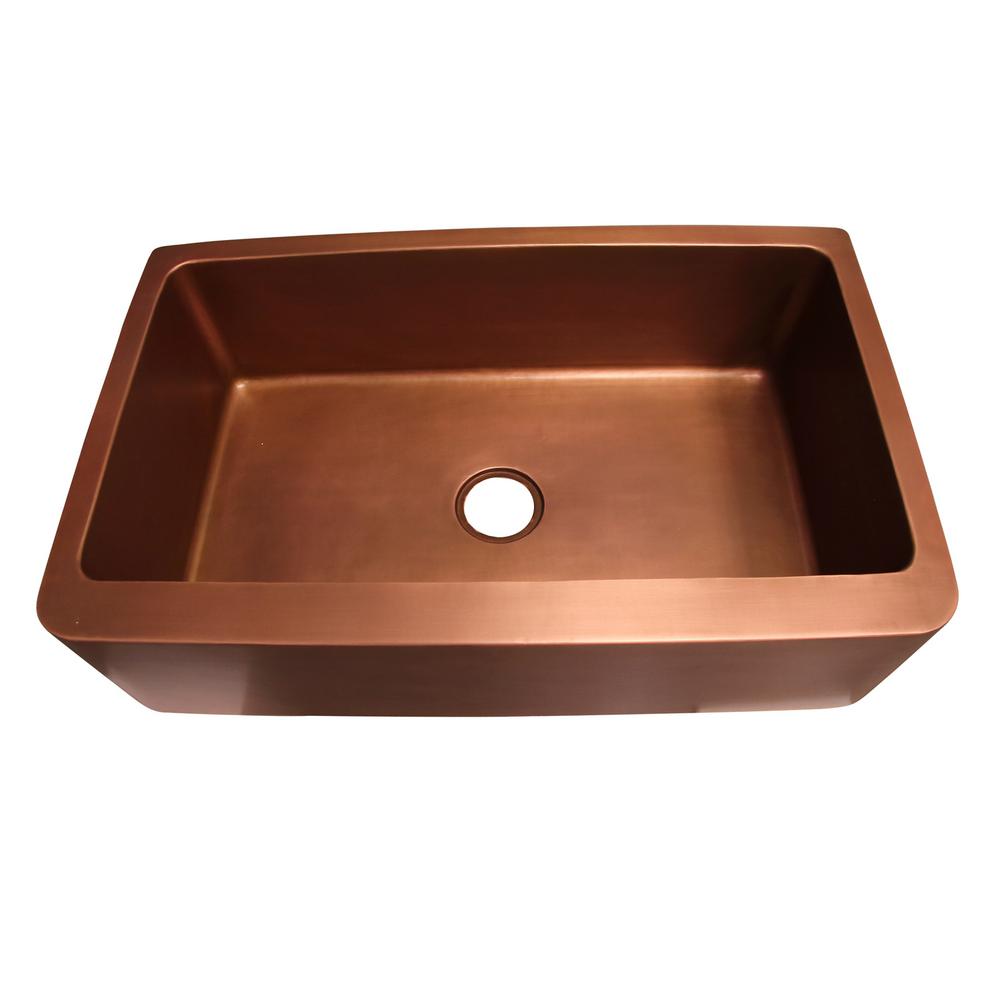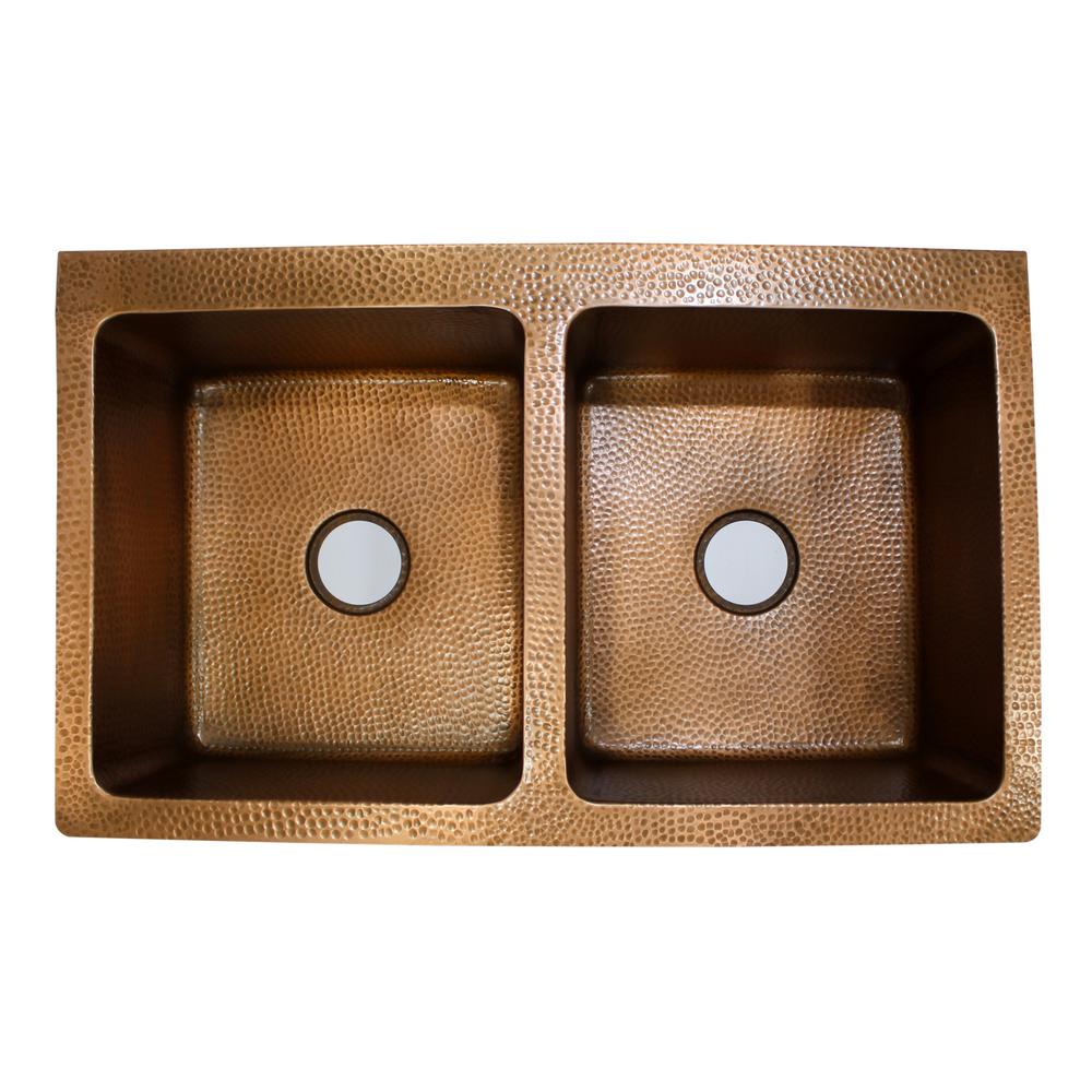 36" Fiona Hammered Copper Farmhouse Sink Give your kitchen polish and performance with the Fiona Farmhouse Sink. Made of 16-gauge copper with a hand-polished finish, this sink features a luminous hammered finish both inside and out. A large well and high sides on the Fiona make it easy to wash and rinse even your largest cookware. Copper Sinks for your Kitchen Drop-In Copper Sinks. Sinkology's copper kitchen drop-in sinks are designed to fit perfectly and simply into pre-cut countertops. We design all of our drop-in kitchen sinks to be extremely easy to install; so that a fresh new kitchen is