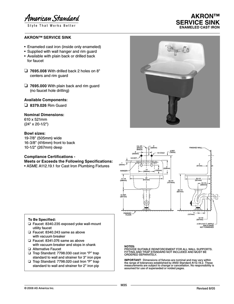 Find helpful customer reviews and review ratings for American Standard 7692.008.020 Lakewell Cast Iron Wall Mounted Service Sink with Drilled Back 2 Holes on 8-Inch Center and Rim Guard, 22 by 18-Inch, White at Amazon.com. Read honest and unbiased product reviews from our users. American Standard 7692.008.020 Lakewell Cast Iron Wall Mounted Service Sink with Drilled Back 2 Holes on 8-Inch Center and Rim Guard, 22 by 18-Inch, White 3.7 out of 5 stars 27 $405.40 830AA - Service Sink Faucet Chrome plated, faucet with vacuum breaker, integral stops, adjustable wall brace, pail hook and 3/4" (19mm) hose thread on